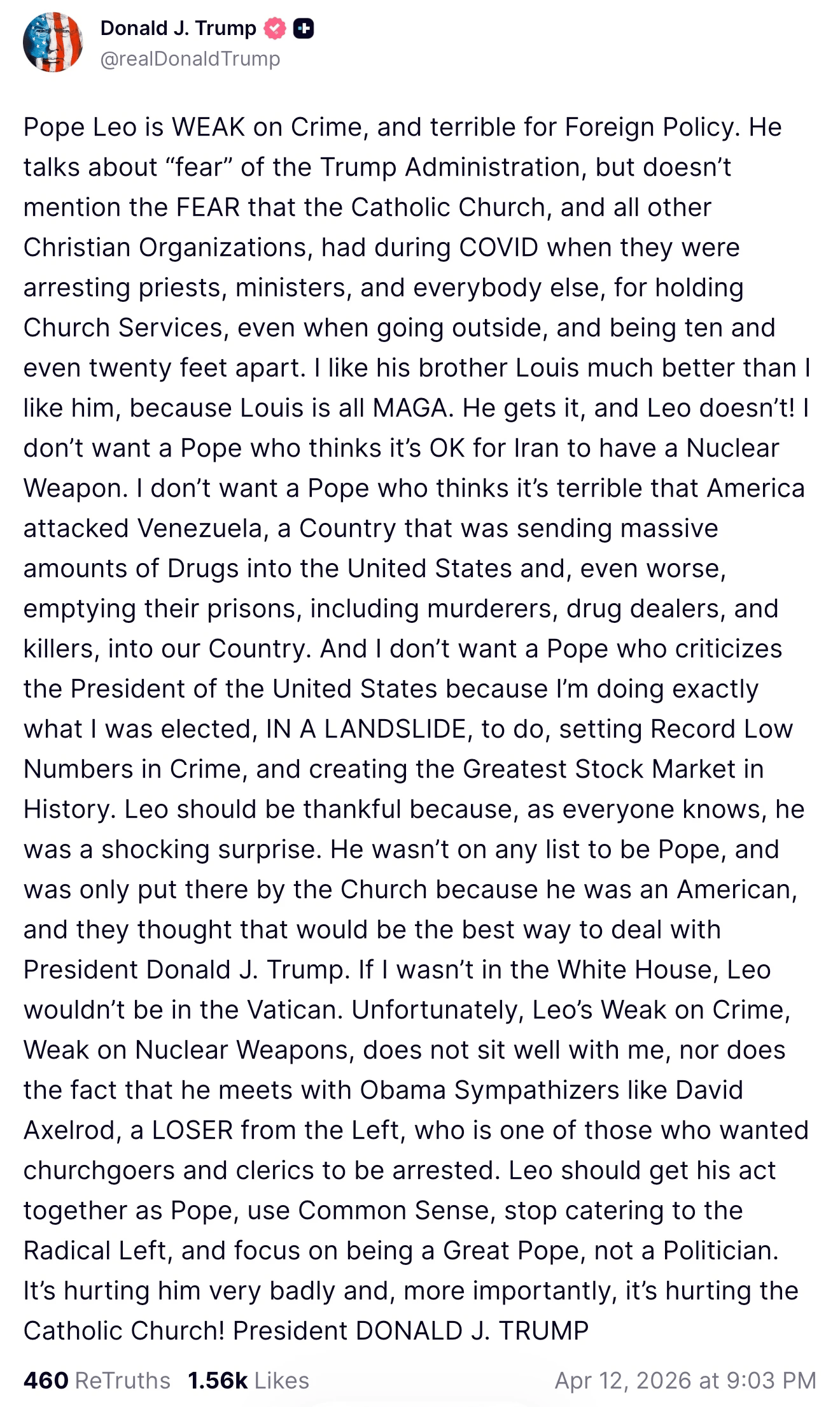 I don’t want a Pope who thinks it’s OK for Iran to have a Nuclear Weapon. I don’t want a Pope who thinks it’s terrible that America attacked Venezuela, a Country that was sending massive amounts of Drugs into the United States and, even worse, emptying their prisons, including murderers, drug dealers, and killers, into our Country. And I don’t want a Pope who criticizes the President of the United States because I’m doing exactly what I was elected, IN A LANDSLIDE, to do, setting Record Low Numbers in Crime, and creating the Greatest Stock Market in History.